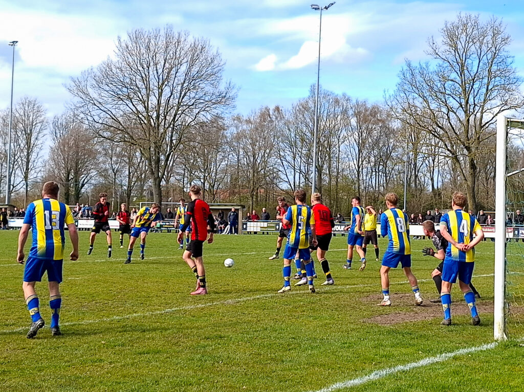 Bij de foto: Tom Allema (in rode shirt, geheel links) laat de bal van zijn voet vertrekken voor de 0-1. Foto Robert Wagter.